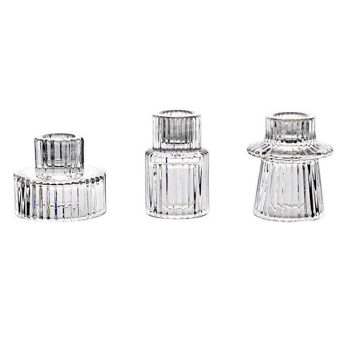 Decorate your special day with glass candle holders from Leilani Wholesale! Our candle holders are great for weddings, parties, events or simply using them in your own home. This set of candle holders can be filled with your taper or LED candles and are ideal as decorative accents for your dinner tables. Perfect as centerpieces, mantelpiece accents, or decor anywhere in your home, these ribbed glass candle holders will add elegance to your space.